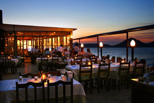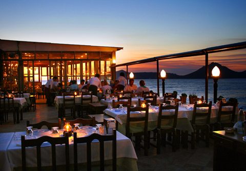 Körfez Restoran’da deniz kıyısında, balık yemenin keyfi hele günbatımları harika oluyor.