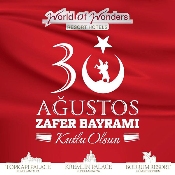 30 Ağustos Çarşamba gecesi 19:30 – 23:00 arasında WOW Bodrum Resort’ta 30 Ağustos Zafer Bayramı Partisi var. Kaçırmayın!